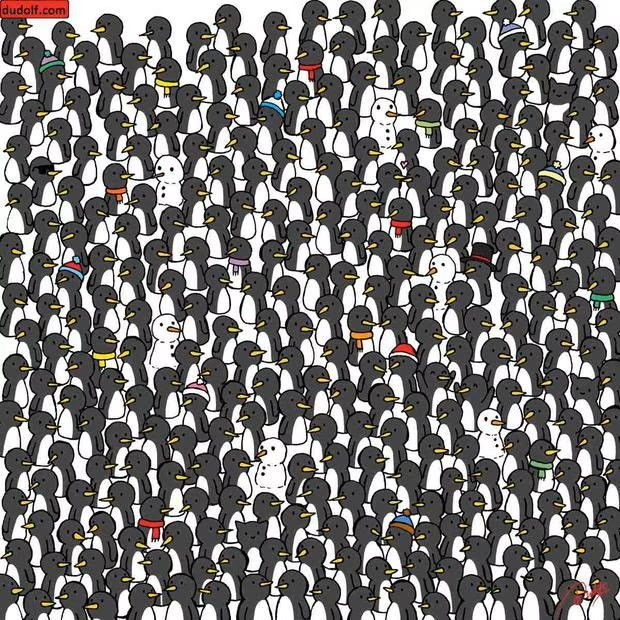 The three cats hidden among the penguins look quite similar. They even strongly resemble the penguins themselves. Key features to look for are their white bellies and black ears – distinguishing traits not found on the birds. See if you can spot any protruding cat ears. Did you find any?