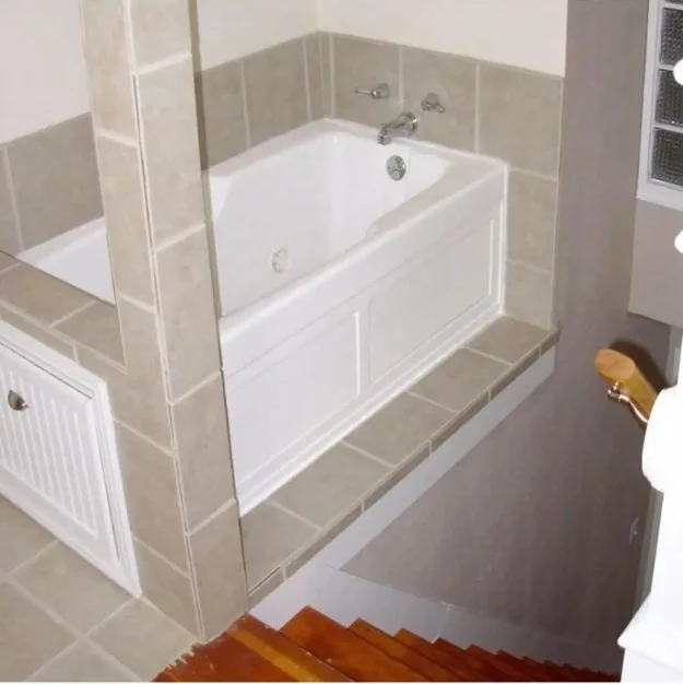 A bathtub at the top of a staircase—because nothing says “relaxing soak” like the risk of a full-body tumble into your living room.