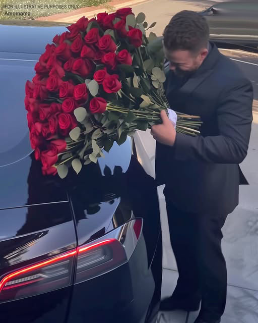 He grinned, holding out a bouquet of deep red roses. “Happy anniversary, babe.”