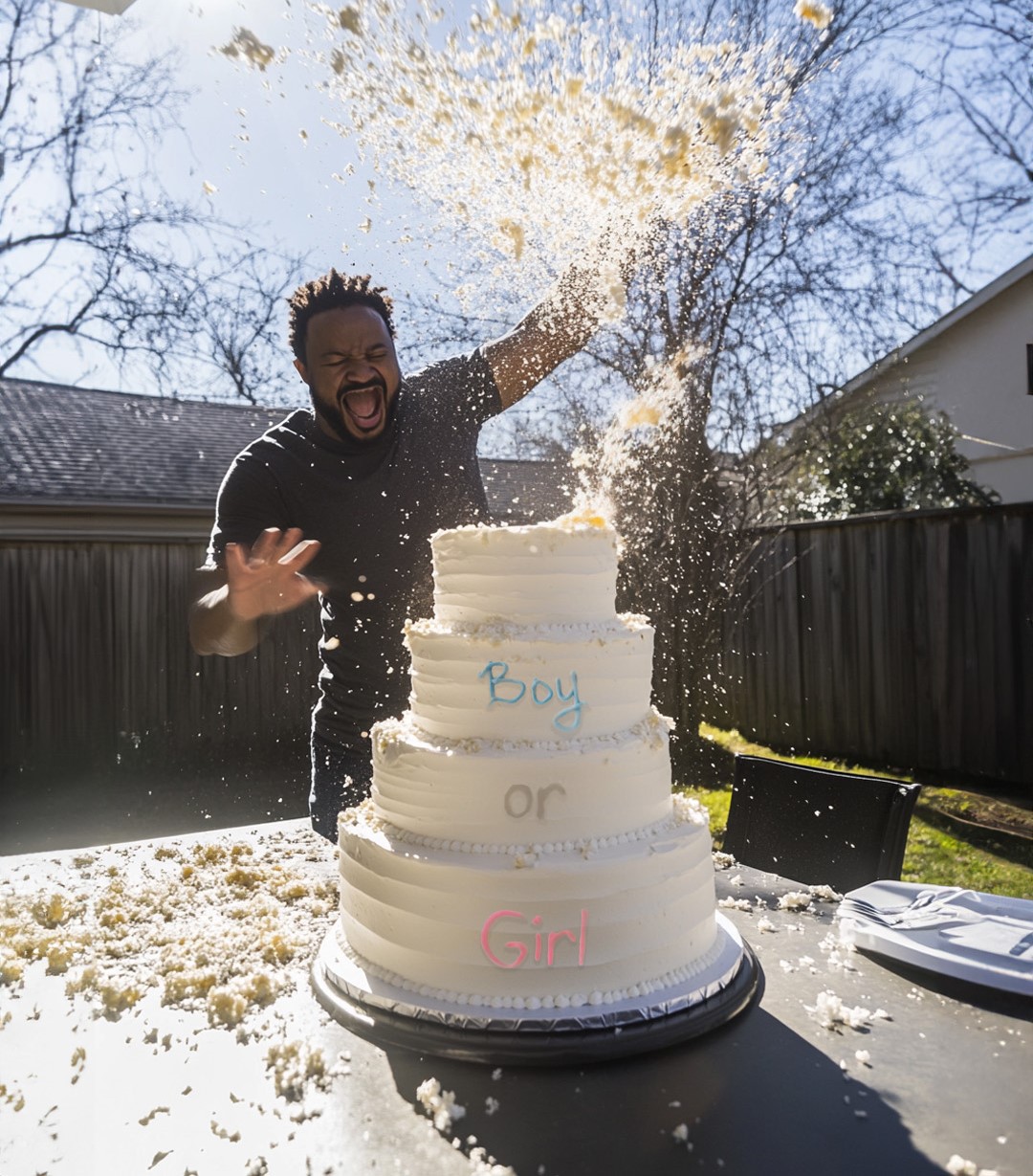 The cake he ordered for the occasion was perfect: a three-tiered showstopper with gold accents, lettering, and smooth, white icing. Inside, the color of the cream would reveal the baby’s gender.
