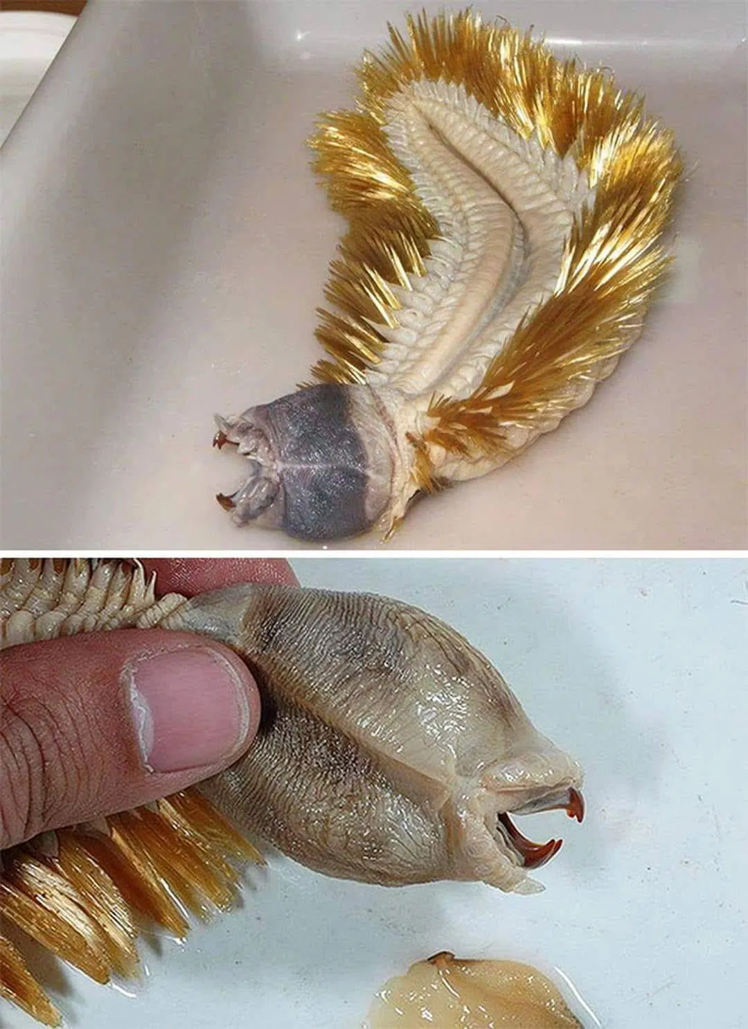 For those who first encountered its image online, the creature’s golden bristles and hauntingly extended jaws sparked fascination and fear. One viral Facebook post showed a specimen recovered from a depth of over 1,700 feet, its grotesque form fully visible as it flashed its creepy, extruded mouthparts. Social media was buzzing with a mix of awe and horror, with many wondering if this was an undiscovered alien species.
