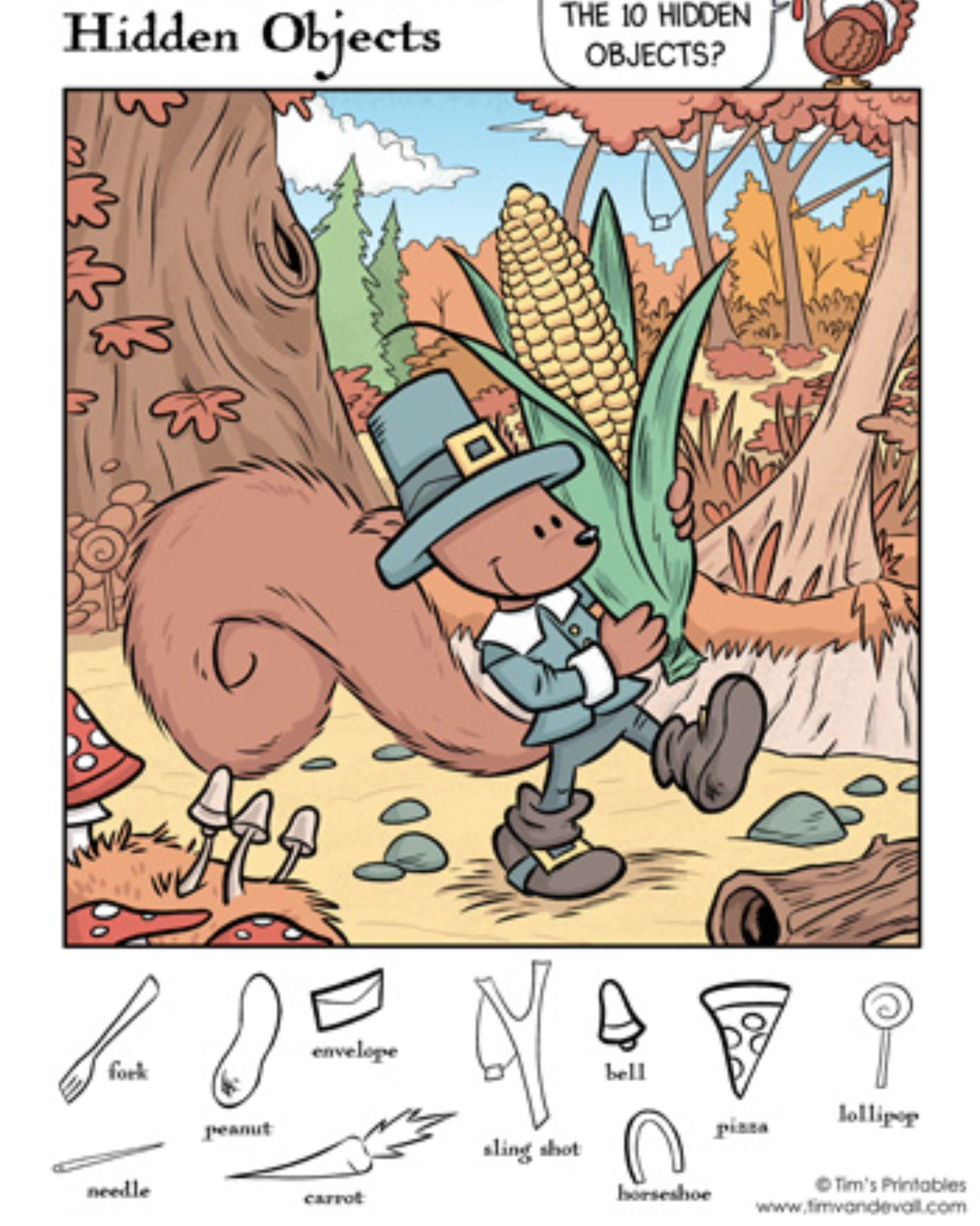 Ready to put your eagle eyes to the test? Dive into this charming autumn adventure featuring a pilgrim squirrel carrying corn through the woods — but don’t let the cozy vibes fool you. Hidden within this delightful artwork are 10 cleverly concealed objects waiting to be discovered!
