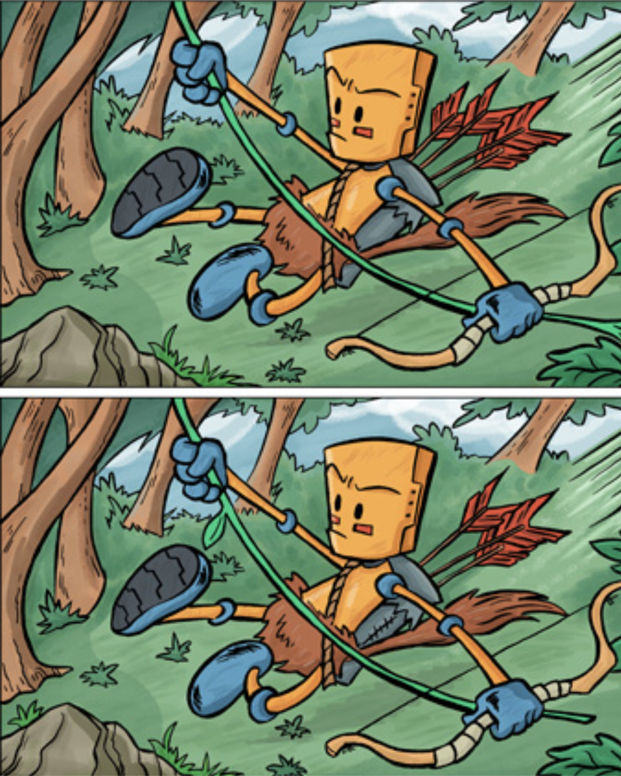Deep in the heart of the jungle, our brave wooden warrior swings through the trees with bow in hand and arrows on his back. But something’s… off. Or should we say, several somethings. Welcome to your next brain-tickling challenge: Spot the 7 Differences!