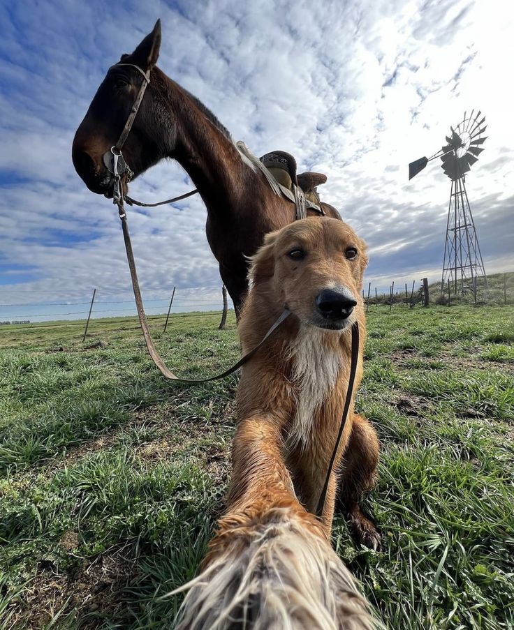 Right behind him was a dark brown horse with a worn leather saddle, reins dragging in the dust—and Barley had the reins in his mouth like he was proudly walking it home.