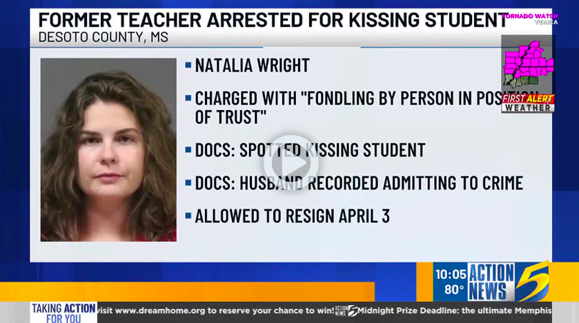 Wright’s husband allegedly obtained footage and audio recording of her admitting to kissing the student on multiple occasions while tutoring the student.