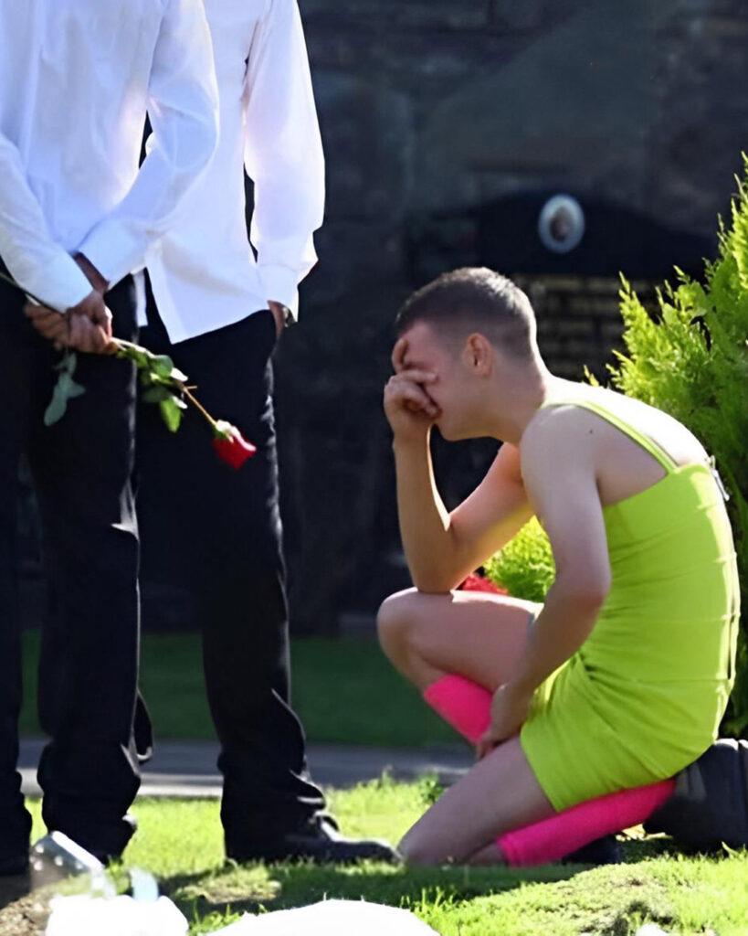 As he stepped into the cemetery dressed in that bright green dress and pink socks, the crowd erupted into spontaneous applause. Some smiled through their tears, knowing that this was Barry keeping a sacred promise to his friend. Barry himself was overwhelmed. Grief-stricken and trembling, he knelt down by Kevin’s grave and embraced his family in silence, his heart too full for words.