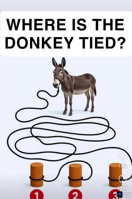 Take a close look at the picture — you’ll see a donkey with a rope around its neck. The other end of the rope is tangled around three posts numbered 1, 2, and 3.