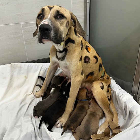 The dogs are now in foster care, where they’ll remain until the puppies are old enough to be weaned and placed in permanent, loving homes.