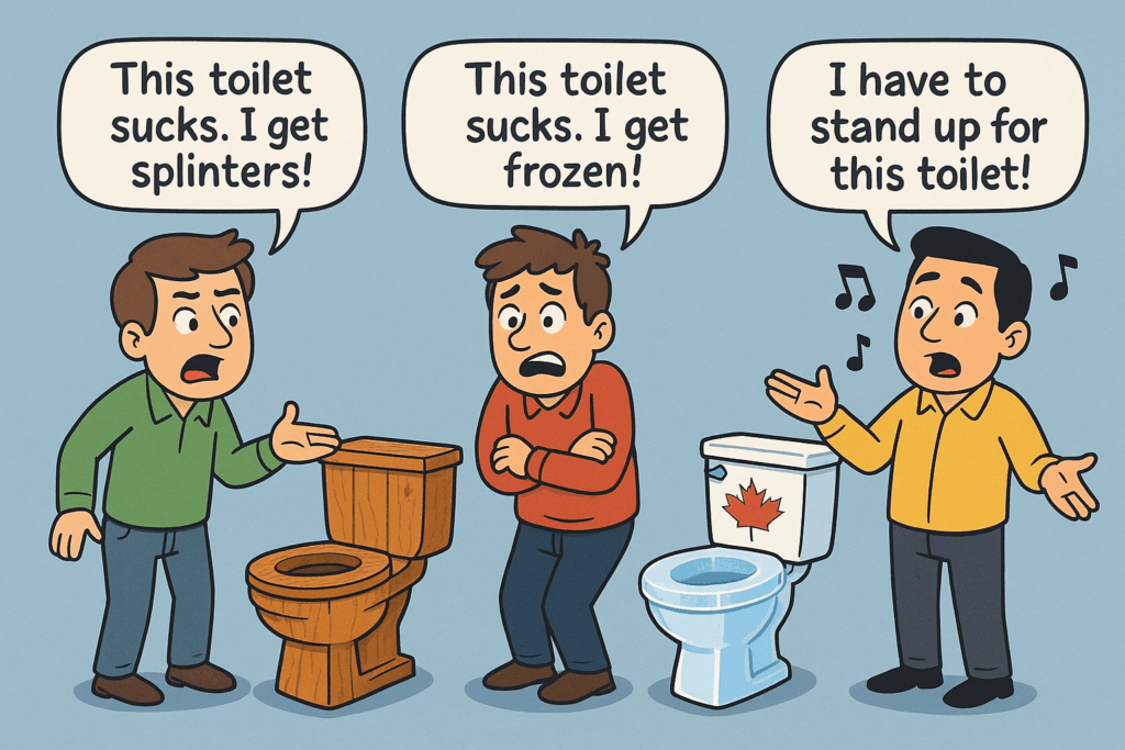 The third man says, “This toilet is too patriotic. Whenever I want to use the toilet, I sit down and the toilet plays ‘O Canada, and I have to stand up’.”