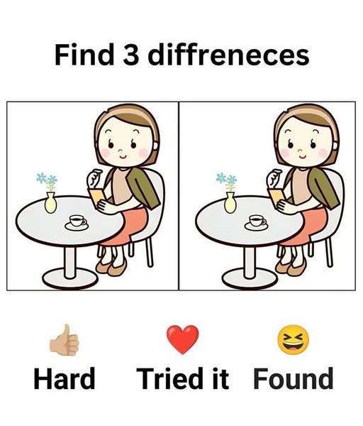 Have you ever found yourself squinting at two almost identical pictures, determined to prove to everyone (and yourself) that you have eagle eyes? That rush you get when you finally spot a hidden change is no accident—it’s a tiny triumph that signals your brain’s pattern-recognition circuits firing on all cylinders. In our charming café illustration, a woman sits alone at a round table, sipping from a cup and absorbed in a small notebook or smartphone. A delicate vase of blossoms brightens the tabletop. Yet, despite the apparent simplicity, three subtle tweaks separate the left image from the right. In this article, we’ll explore why these puzzles captivate us, share strategies to uncover every difference, and reveal the three modifications hiding in plain sight.