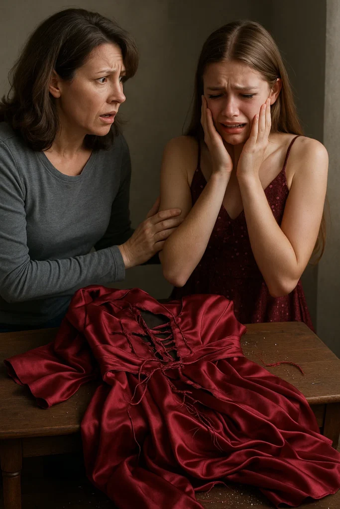 It lay in a twisted mess on the bench. The satin fabric had been cut, deep and jagged across the bodice. Loose threads hung like spider legs, and sequins sparkled uselessly on the floor.