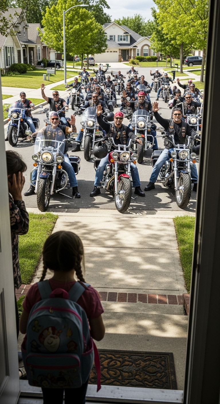The sound came first—deep, rolling rumbles echoing down Maple Street. People opened their curtains, confused. One by one, motorcycles pulled up to the curb. Gleaming Harleys, patched old cruisers, and bikes that looked like they’d seen half the country lined the road.