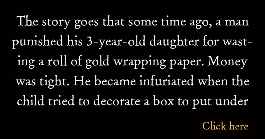 The story goes that some time ago, a man punished his 3-year-old daughter for wasting a roll of gold wrapping paper. Money was tight. He became infuriated when the child tried to decorate a box to put under the Christmas tree. Nevertheless, the little girl brought the gift to her father the next morning and said,