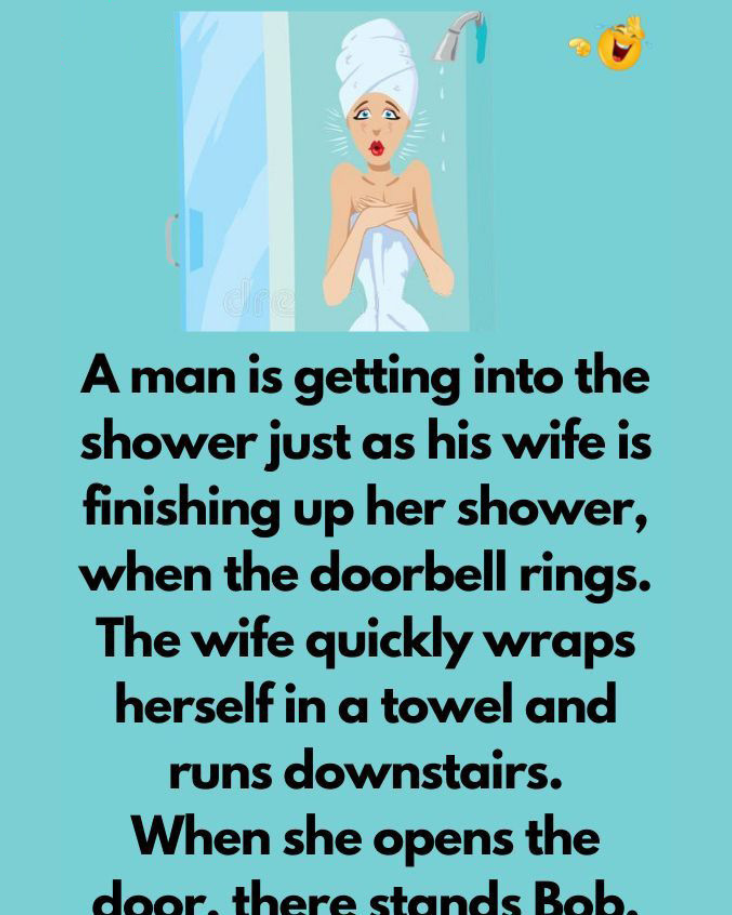 The wife quickly wraps herself in a towel and runs downstairs.When she opens the door, there stands Bob, the next-door neighbor.