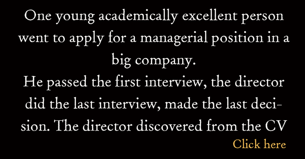 He passed the first interview, the director did the last interview, made the last decision. The director discovered from the CV that the youth’s academic achievements were excellent all the way, from the secondary school until the postgraduate research. Never had a year when he did not score.