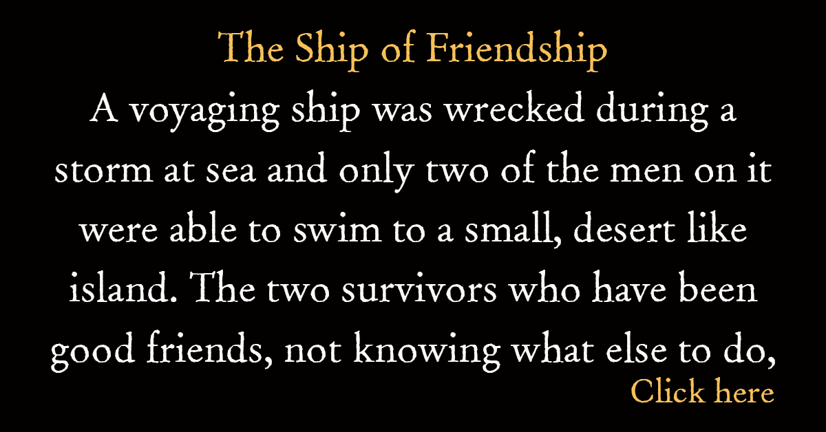 A voyaging ship was wrecked during a storm at sea and only two of the men on it were able to swim to a small, desert like island. The two survivors who have been good friends, not knowing what else to do, agreed that they had no other recourse but to pray to God. However, to find out whose prayer was more powerful, they agreed to divide the territory between them and stay on opposite sides of the island.