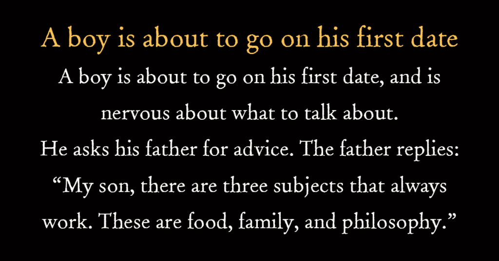 He asks his father for advice. The father replies: “My son, there are three subjects that always work. These are food, family, and philosophy.”