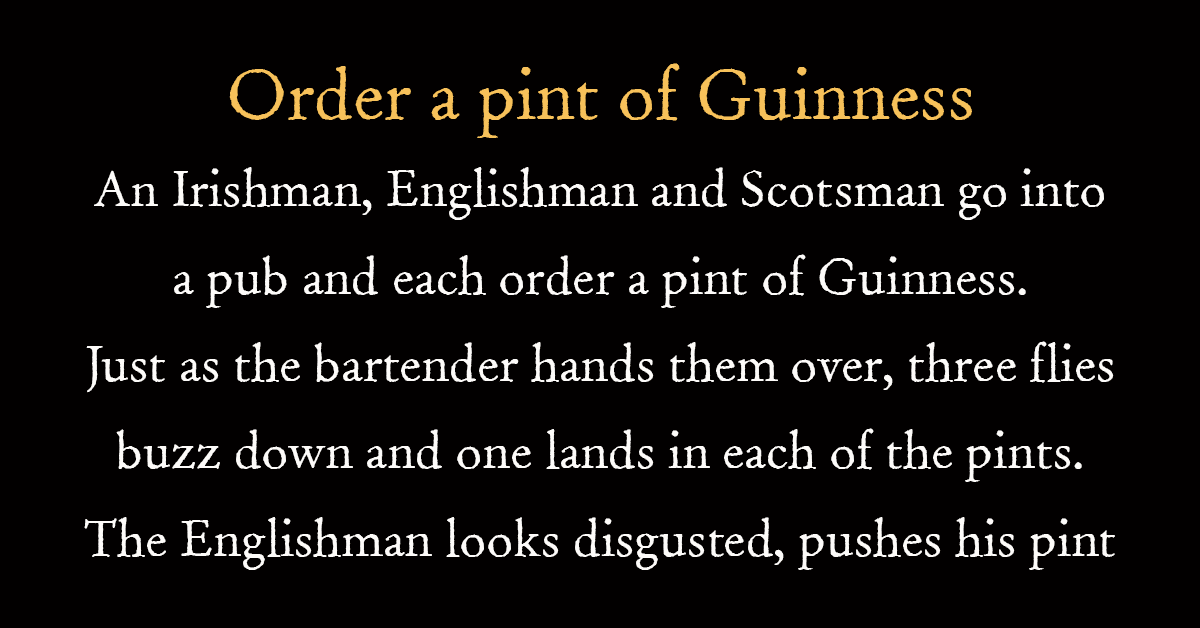 An Irishman, Englishman and Scotsman go into a pub and each order a pint of Guinness.