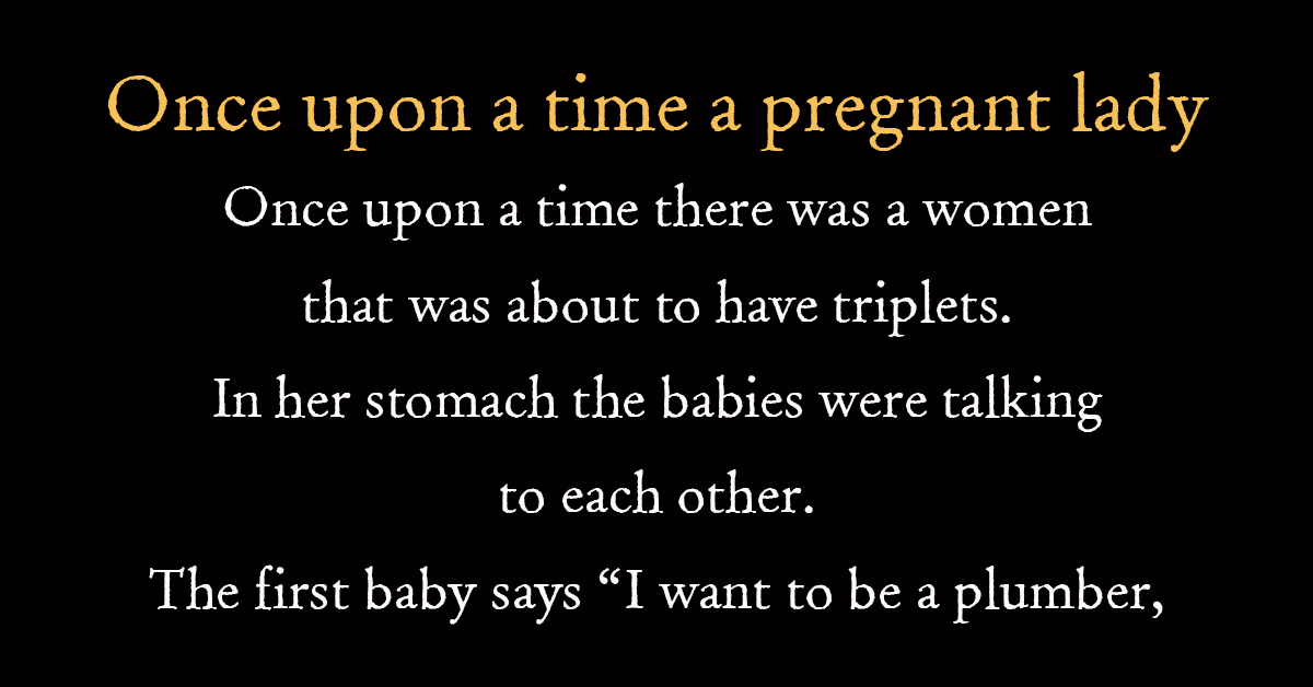 The first baby says “I want to be a plumber, because there is so much water in here”.