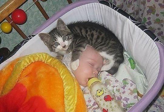 It jumped into the little one’s crib and tried to calm them down. The cat attempted to be nurturing and provide the comfort the child needed to settle down.