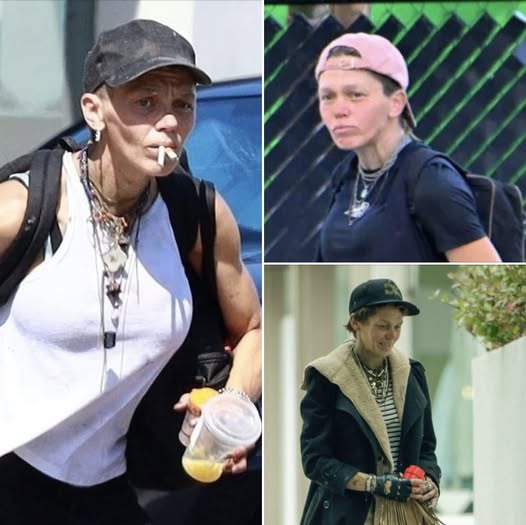 The once gorgeous blonde model is unrecognizable in the her dumpy, dirty clothes.