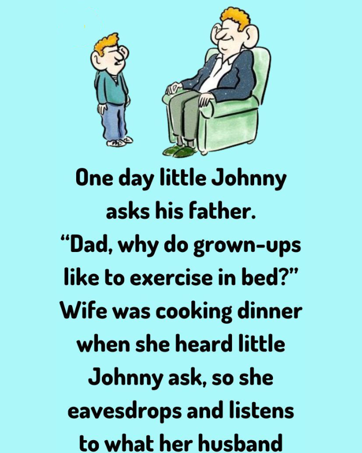 One day little Johnny asks his father “Dad, why do grown-ups like to exercise in bed?” Wife was cooking dinner when she heard little Johnny ask, so she eavesdrops and listens to what her husband will have to say.