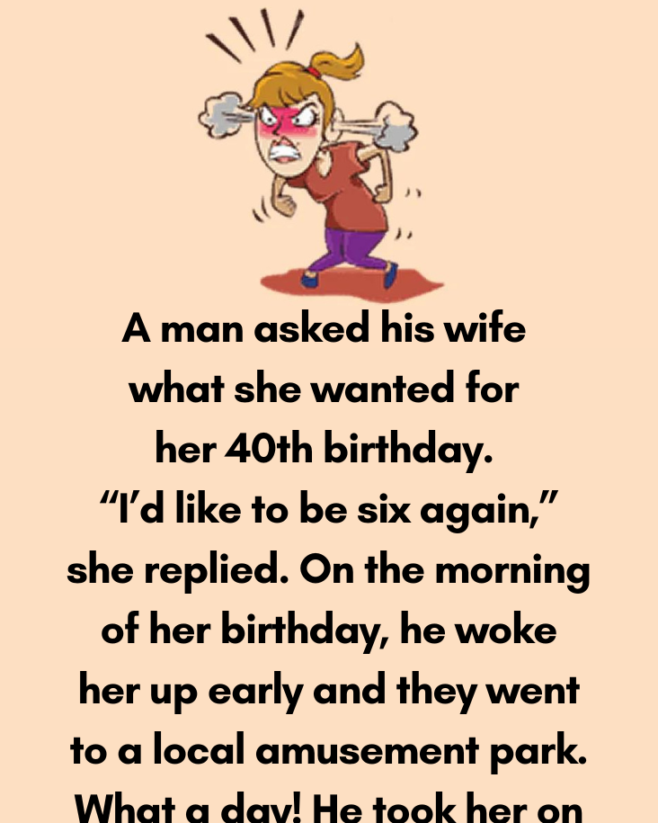 A man asked his wife what she wanted for her 40th birthday. “I’d like to be six again,” she replied. On the morning of her birthday, he woke her up early and they went to a local amusement park. What a day! He took her on every ride in the park: D_eath Slide, Scream Loop, Wall of Horror, everything! Wow! Five hours later, dizzy and sick to his stomach, he staggered out of the amusement park.