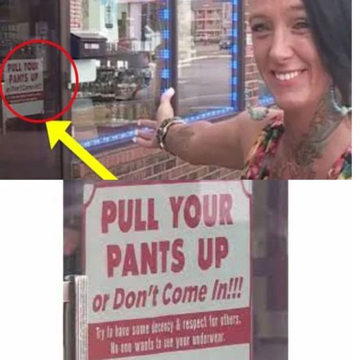The sign further read: “Try to have some decency and respect for others. No one wants to see your underwear.”