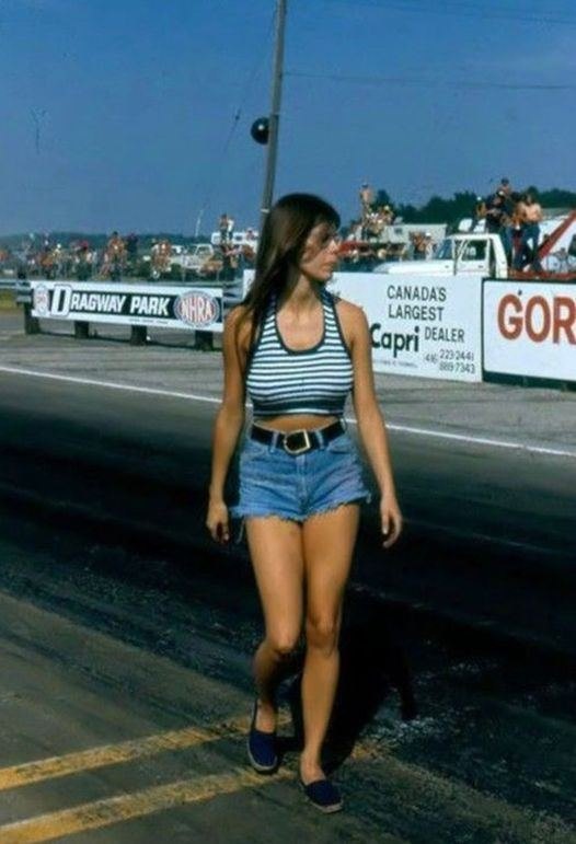 ou can see Pam walking on the race track, wearing one of her signature outfits: a striped tank top, short denim shorts, and flat shoes. The sign in the background mentions “Ragway Park” and the National Hot Rod Association (NHRA), which were associated with drag racing events in North America.