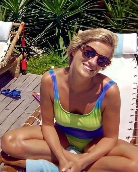 This heartwarming throwback shows the late Princess Diana lounging aboard a yacht, effortlessly stylish in a tied shirt, printed bikini bottoms, and dark sunglasses.