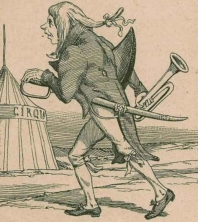 The visual deception painting depicts a circus artist wearing an old-fashioned costume, with an image of an elephant embedded in the painting.